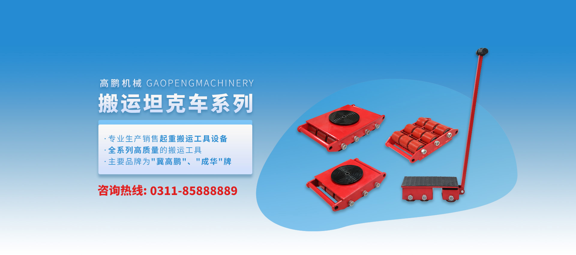 高鵬機(jī)械專(zhuān)業(yè)生產(chǎn)膠皮輪、鋼輪、尼龍輪系列各噸位型號(hào)搬運(yùn)小坦克車(chē);